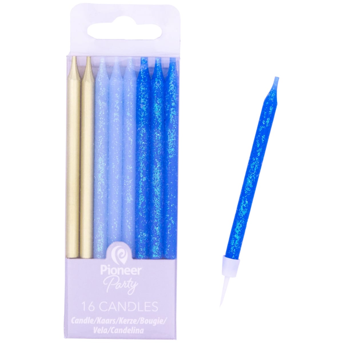 3502-3699 Упаковка свічок в торт не ароматизовані Блакитні та золоті з блискітками (0шт/уп.), розмір 6 см