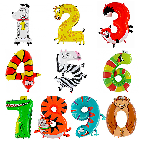 1207-0012 Фольгированный шар с гелием Цифры в форме ЗВЕРЕЙ (от 0 до 9 на выбор) 40", размер 102 см
